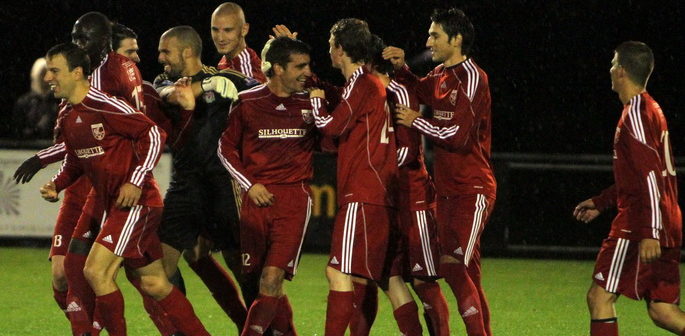 Une « mine » et un coup de génie ont rapidement hypothéqué les chances des hommes de Gianluca Gnoni. Dès la 9ème minute, Fabien Calleja botte un coup franc en force, profitant d’une pelouse humide pour battre Chamberlain. Puis à la 13ème, Lhoneux se présente seul face au malheureux gardien et pique majestueusement sa balle. Le troisième but collésien sera l’œuvre de Quilez, transfuge d’Etoile Carouge, qui enroule parfaitement son coup-franc à la 30ème minute.