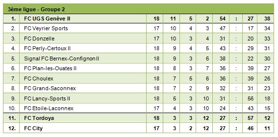 Victorieux contre Veyrier, UGS II fait la bonne affaire de la journée puisque Donzelle a été tenu en échec. Les Ugéistes s’assurent de rester en tête même après les matchs à rattraper de leurs poursuivants. City et Tordoya n’avancent pas et restent toujours relégables.