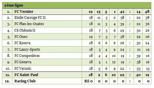 C’était attendu mais c’est désormais officiel : Vernier est mathématiquement champion de 2ème ligue et promu en 2ème ligue inter. Saint-Paul n’obtient pas mieux qu’un nul contre Compesières et revient à trois longueurs de la barre avec encore six points en jeu.