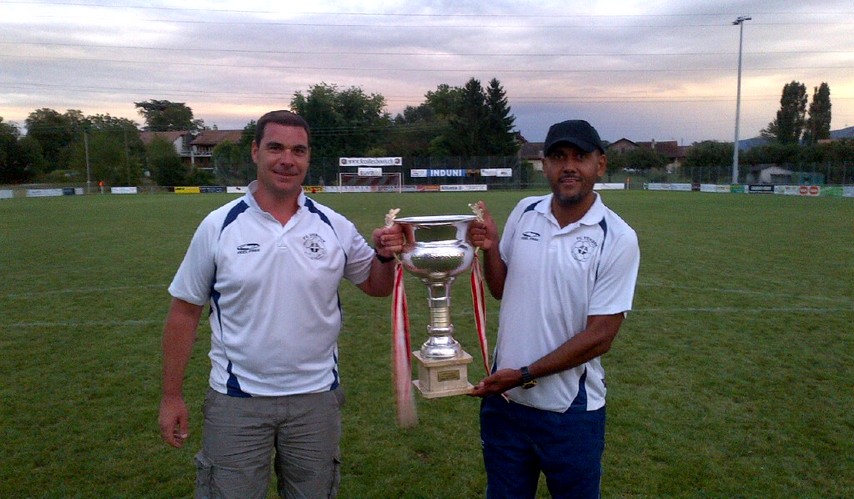 Auro Duarte (à droite) et Ugo De Stefano (à gauche), posent avec la coupe du Tournoi des Campagnes (Photo: FC Collex-Bossy)