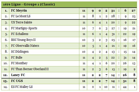 11ème journée / 6ème victoire consécutive pour les Meyrinois qui restent logiquement en tête. Le derby de la peur entre UGS et Lancy a accouché d’un match nul.