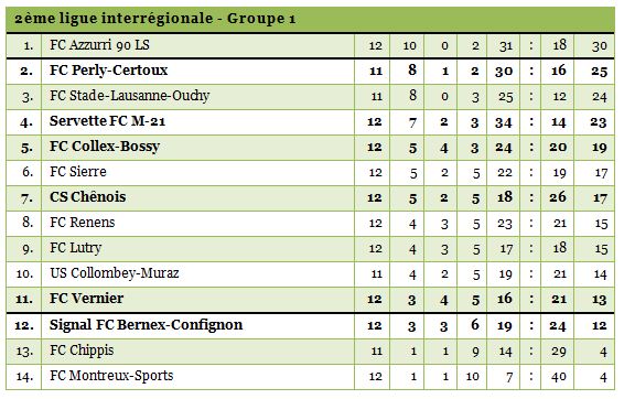 12ème journée / Les derbys de la journée ont changé la donne en bas de tableau : vainqueur de Servette M-21, Vernier sort de la zone rouge au détriment de Bernex qui a été battu par Perly. Chênois poursuit sa belle remontée.