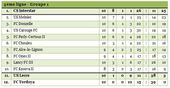 10ème journée / Meinier gagne à Donzelle et reste au contact d’Interstar qui semble intouchable. En bas de tableau, les choses deviennent de plus en plus compliquées pour Lecce et Tordoya qui ne voient pas le bout du tunnel.
