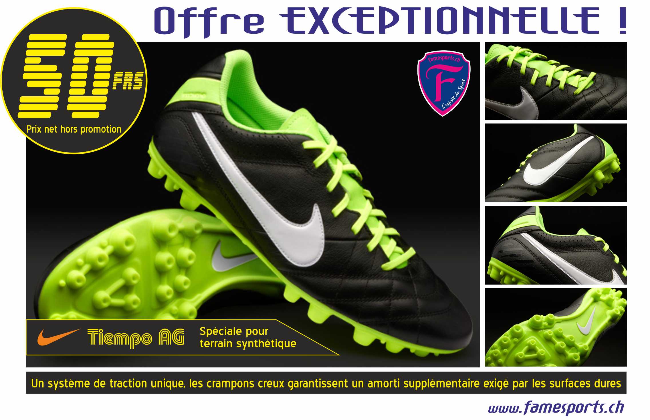 En plus de 30% sur tout le magasin, profitez de l’offre exceptionnelle : Nike Tiempo AG, idéales pour le synthétique, pour seulement 50 CHF !