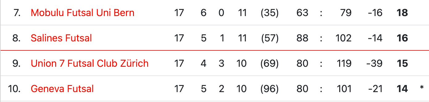 Les enjeux sont diamétralement opposés pour les deux Genevois. Geneva Futsal, qui a vécu une saison difficile en Swiss Futsal Premier League -avec en plus de cela 3 points de pénalité-, aura besoin d’un concours de circonstances pour sauver sa peau. Les Genevois affrontent Wil dimanche au Bout-du-Monde (15h) et, en plus de s’imposer, devront espérer que Salines Futsal s’incline et qu’Union Zurich n’aille pas au-delà du match nul. Une dernière place les relèguerait, tandis que l’avant-dernière place les obligerait à disputer un barrage contre le perdant de la finale de Swiss Futsal Second League. Si la huitième place paraît difficilement atteignable, il faut à tout prix éviter au moins la dixième place.