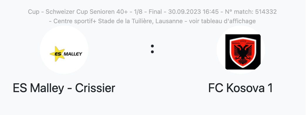 Samedi, 16h45 : ES Malley-Crissier – FC Kosova (40+)
