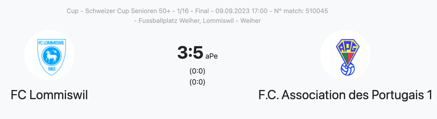 Deux clubs genevois sont encore en lice en 1/8 de finale dans la catégorie 50+ : APG et Choulex. Le club portugais recevra le FC Dardania au Bout-du-Monde, après avoir péniblement sorti, au tour précédent, le FC Lommiswil aux tirs au but (3-5). Dardania a pour sa part infligé un 7-1 au FC Wettwil-Bonstetten.