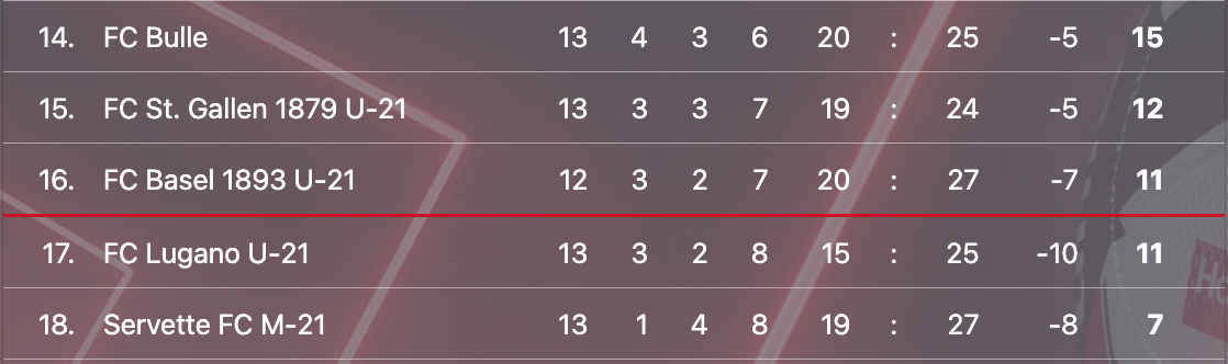 A la 13ème journée, Servette II pointe toujours à la dernière place du classement, à 4 points de la barre.