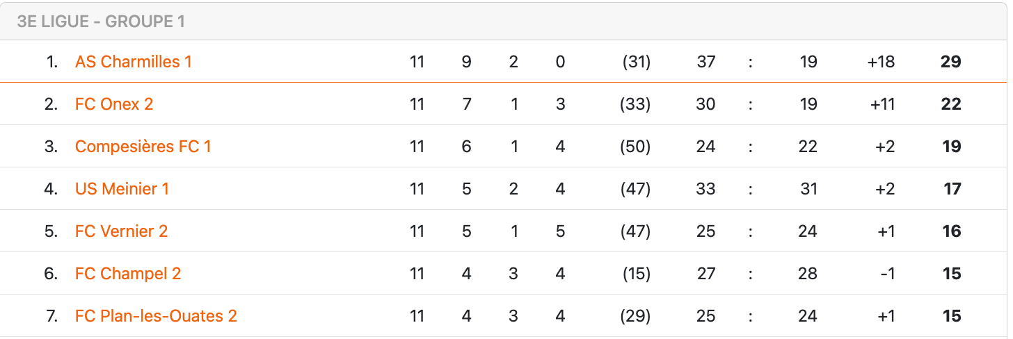Erreur, le groupe n'existe pas! Vérifiez votre syntaxe! (ID: 4)Le championnat reprendra le 10 mars, avec notamment un choc entre les deux poursuivants, Compesières et Onex II. Une aubaine pour Charmilles, qui pourrait profiter de cette confrontation directe pour accroître son avance. Le leader accueillera City II pour la reprise.