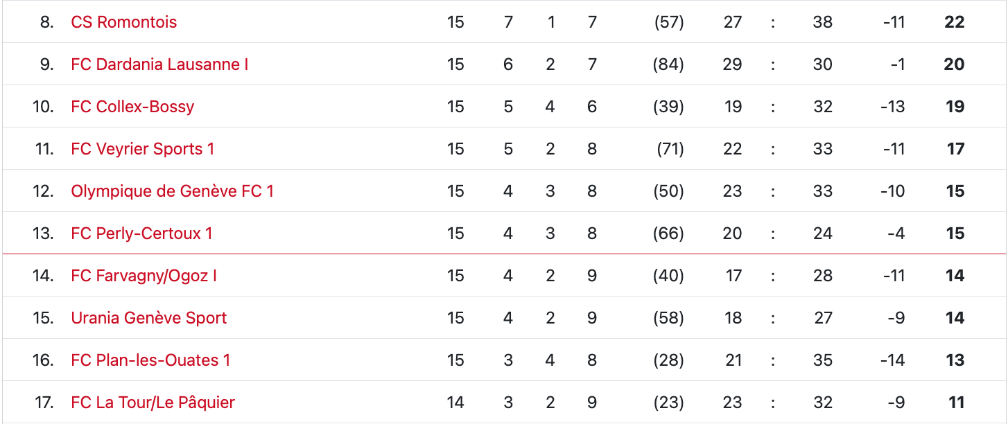 Avec ces trois points, l’Olympique de Genève sort de la zone rouge, mais compte aussi un seul point d’avance sur la barre. Seuls les points fair-play permettent de départager l’Olympique de Genève et Perly-Certoux pour le moment. L’équipe de Yorick Guekam terminera cette première partie de saison avec un derby contre Collex vendredi (20h15) à domicile.