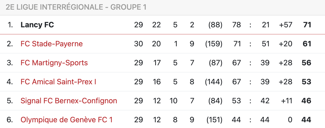 Gr. 1 – Lancy FC – 29m/71pts = 2.45pts/match