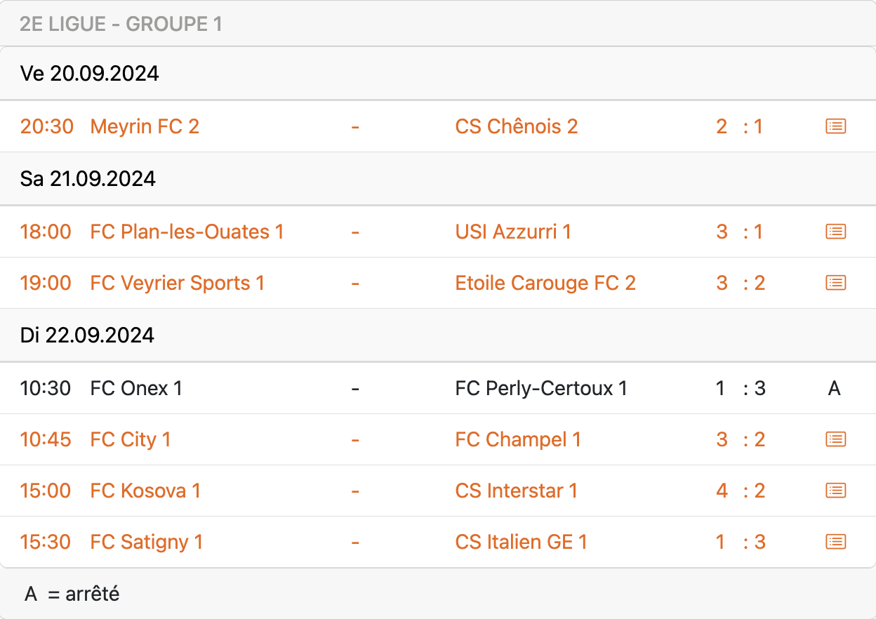 La rencontre de la cinquième journée de 2ème ligue entre le FC Onex et le FC Perly-Certoux n’a pas pu aller à son terme. Les visiteurs menaient 3-1 en plein temps additionnel, à quelques instants de la fin du match, mais l’arbitre de la partie, Monsieur Nicolas Hervieu-Causse, a stoppé le match avant la fin du temps additionnel.