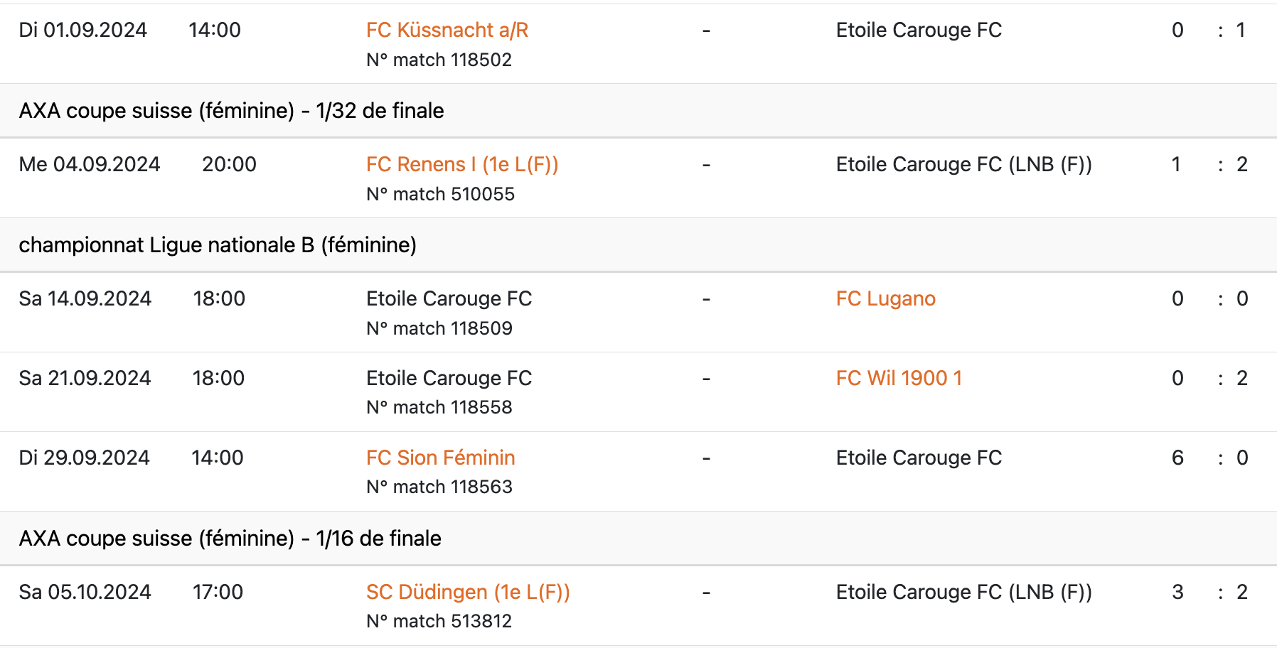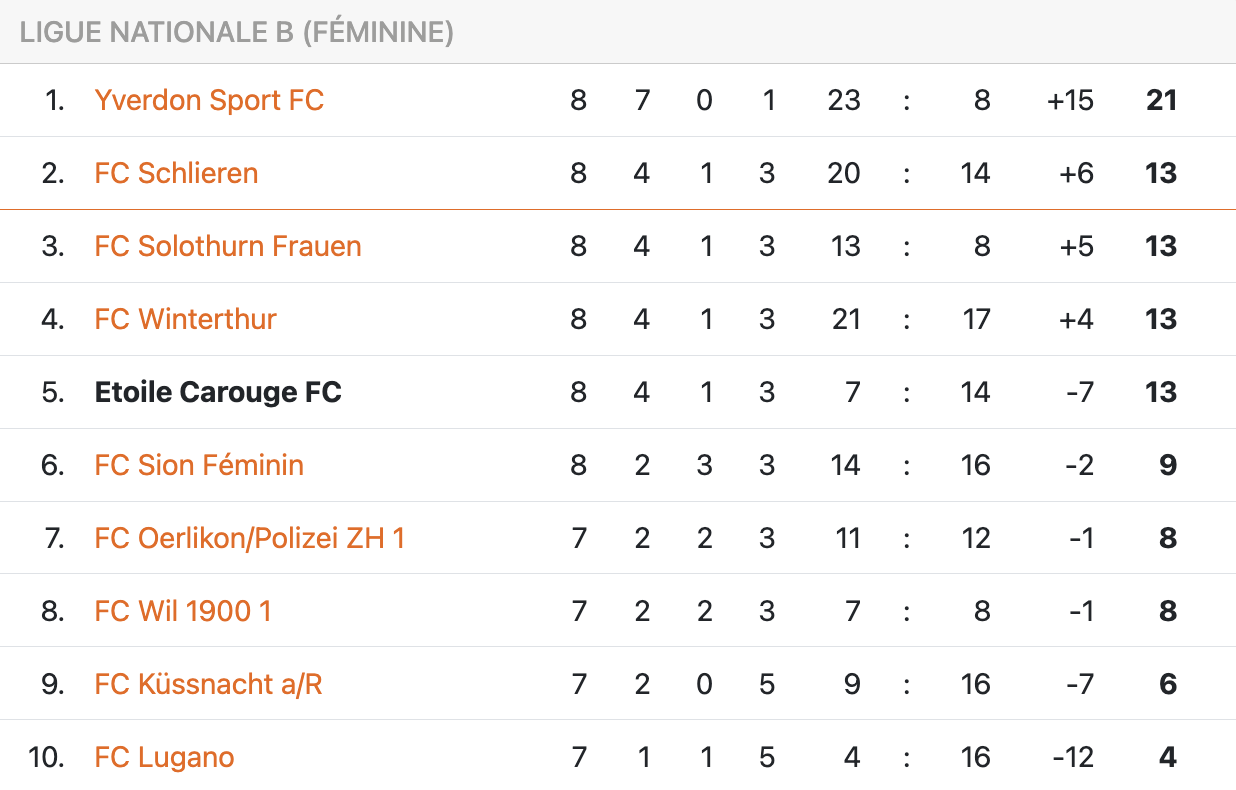 Avec cette victoire, les Carougeoises restent certes cinquièmes, mais se retrouvent à égalité de points avec les trois équipes juste au-dessus. Seul YS Féminin, le prochain adversaire d’Etoile Carouge, a fait le trou en tête (21 points, la seule défaite est un forfait).  Le défi sera de taille pour l’équipe de Diogo Abade Franca, qui pourra compter sur sa confiance retrouvée pour tenter de créer la surprise, samedi prochain au Municipal.