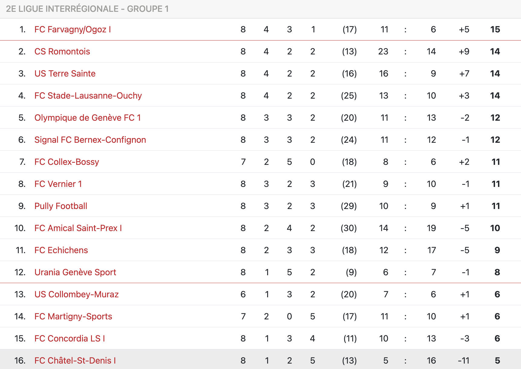 Le classement après huit journées (*Collex et Martigny ont 1 match en moins, Collombey a 2 matchs en moins*)