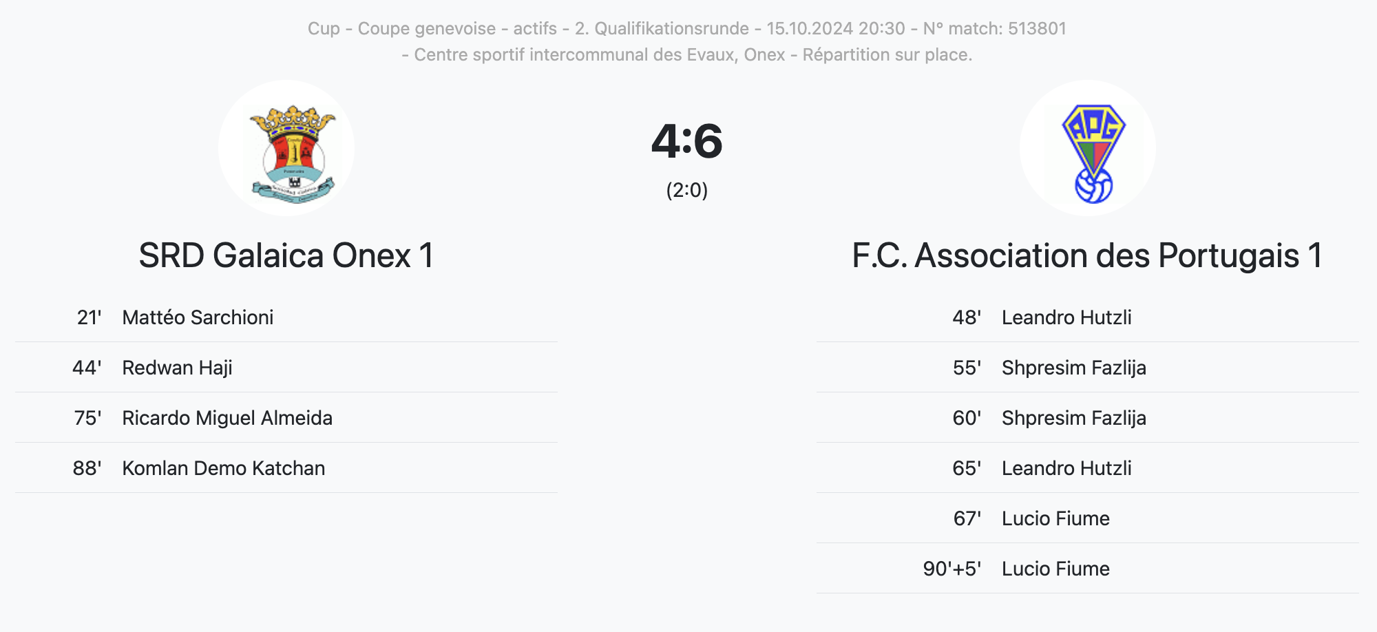 Deux équipes de 4ème ligue ont posé bien des soucis à des formations de ligues supérieures. Galaica Onex, d’abord, mardi soir contre le F.C. Association des Portugais. En difficulté depuis sa promotion en 3ème ligue, APG était mené 2-0 par Galaica à la pause ! Des doublés de Leandro Hutzli, Shpresim Fazlija et Lucio Fiume ont toutefois permis au favori de passer l’épaule.