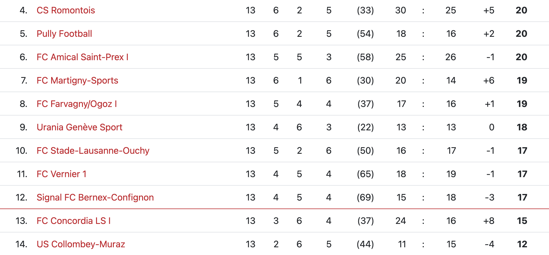 Au classement, l’équipe entraînée par Uros Cetkovic (18 points en 13 matchs) n’a qu’une longueur d’avance sur celle menée par Daniel Nieto (17 points en 13 matchs). La première équipe relégable (Concordia LS, 15pts) n’est pas loin, raison de plus pour ne pas se manquer, samedi.