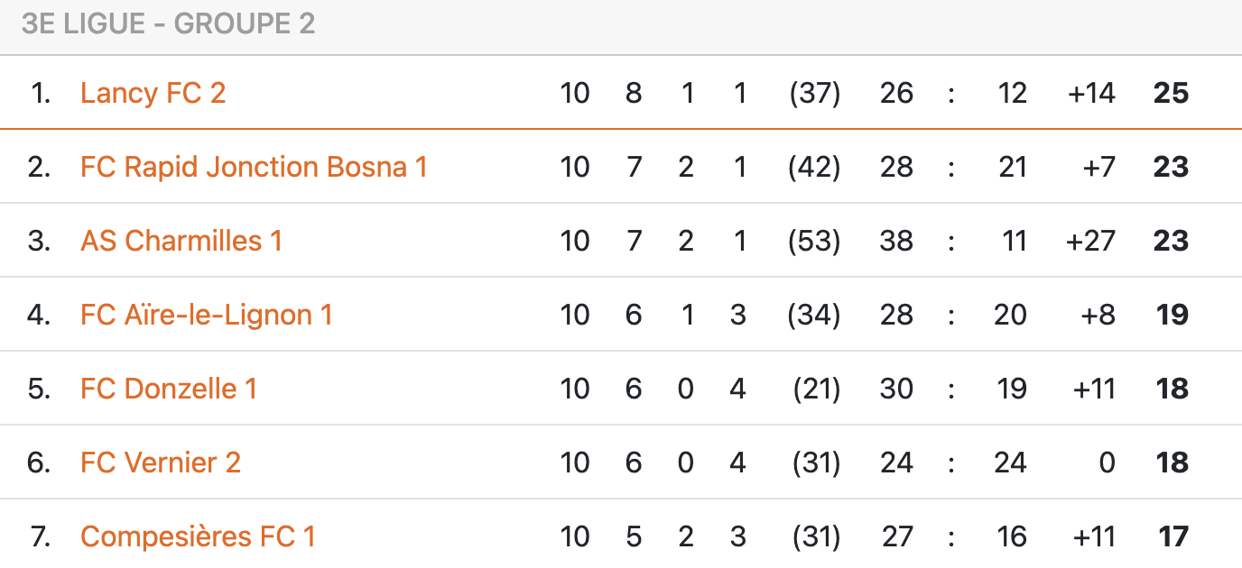 3ème ligue, gr.IIDernière journée avant la trêve en 3ème ligue. Le dicton “le meilleur pour la fin” est valable en ce qui concerne le groupe II, puisque les quatre équipes en tête du classement s’affrontent. Seul sur le trône avec 25 points en 10 journées (!), Lancy II sera assuré d’être champion d’automne en cas de victoire contre Aïre-le-Lignon, qui vient de perdre contre Charmilles et Donzelle.