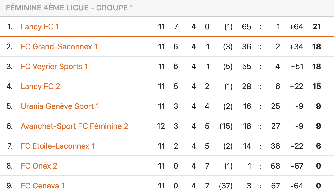 4ème ligue féminineGrand-Saconnex peut-il bousculer Lancy (7/7 victoires, 65 buts marqués et 1 seul encaissé cette saison) ? Réponse dimanche après-midi avec un choc qui promet. Créée cet été, l’équipe saconnésienne est bien partie et occupe la deuxième place avec six victoires et un seul revers.