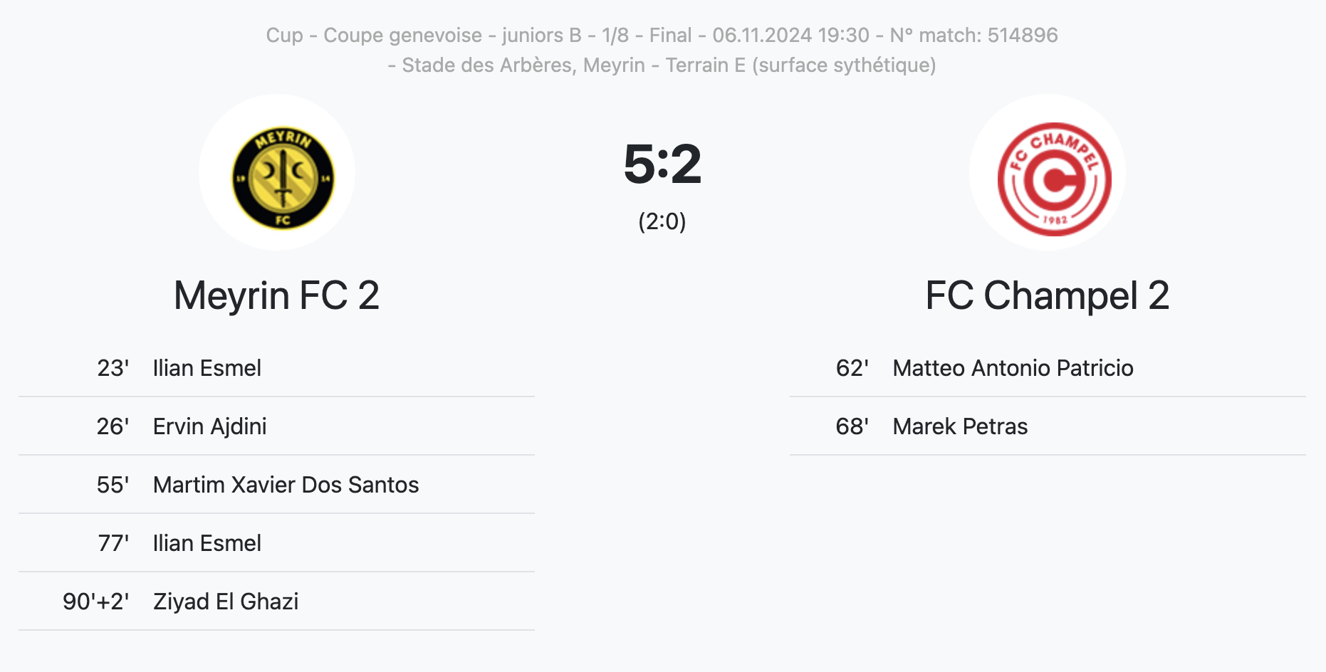 Meyrin II s’est lui aussi imposé par trois buts d’écart, mercredi soir contre Champel II. Les Jaune et Noir, cinquièmes du groupe 2 de B 1er degré, ont battu Champel II, 5ème du groupe 1. Les Meyrinois menaient 3-0 à la 55e. Champel est revenu à 3-2 à la 68e, mais les buts d’Ilian Esmel (77′, 4-2) et de Ziyad El Ghazi (92′, 5-2) ont permis aux locaux d’assurer leur qualification.