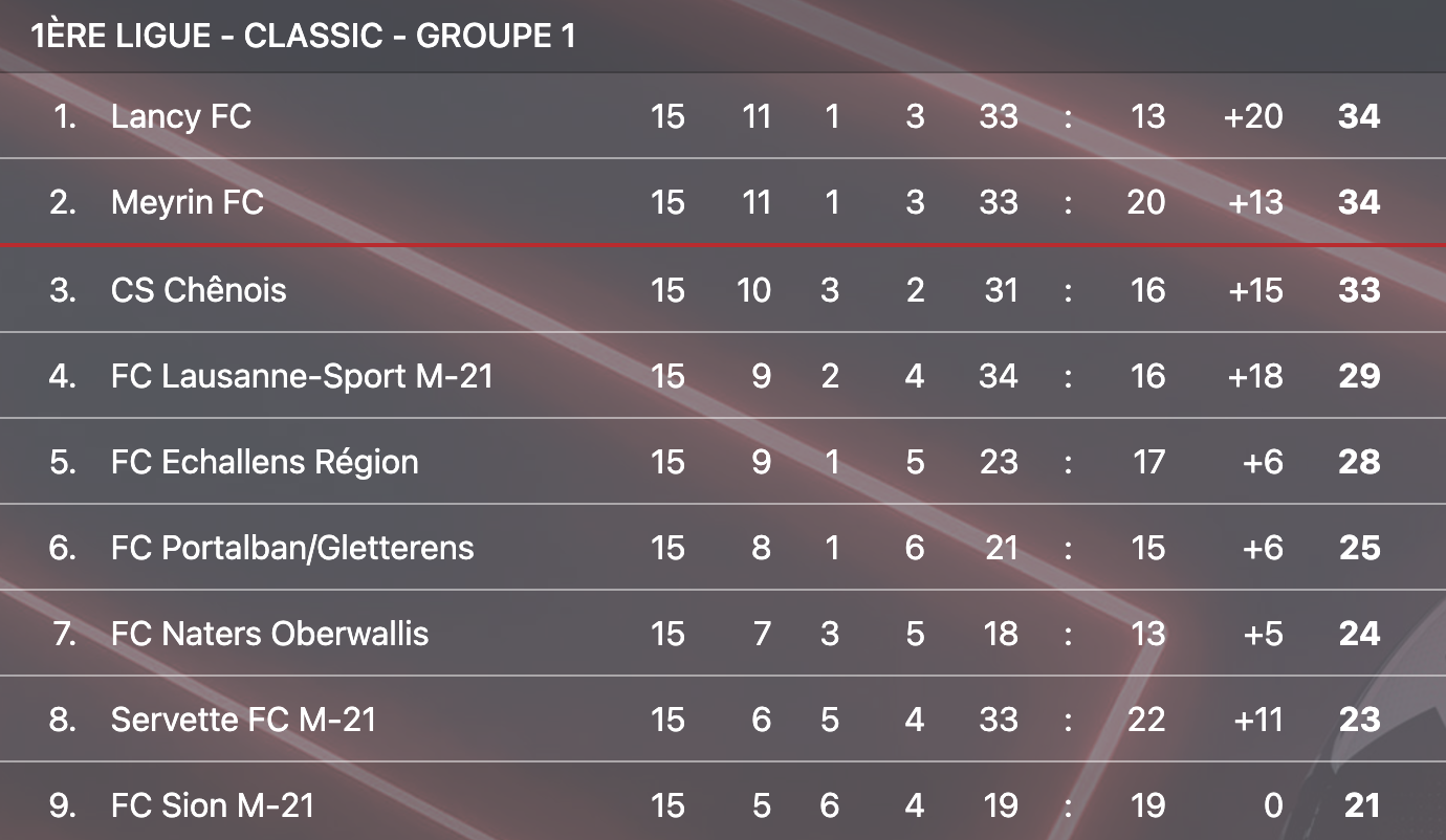 Lancy, Meyrin et Chênois mènent toujours la danse. Servette M-21, 8ème, est l’équipe la plus en forme du championnat avec 5 victoires de rang.