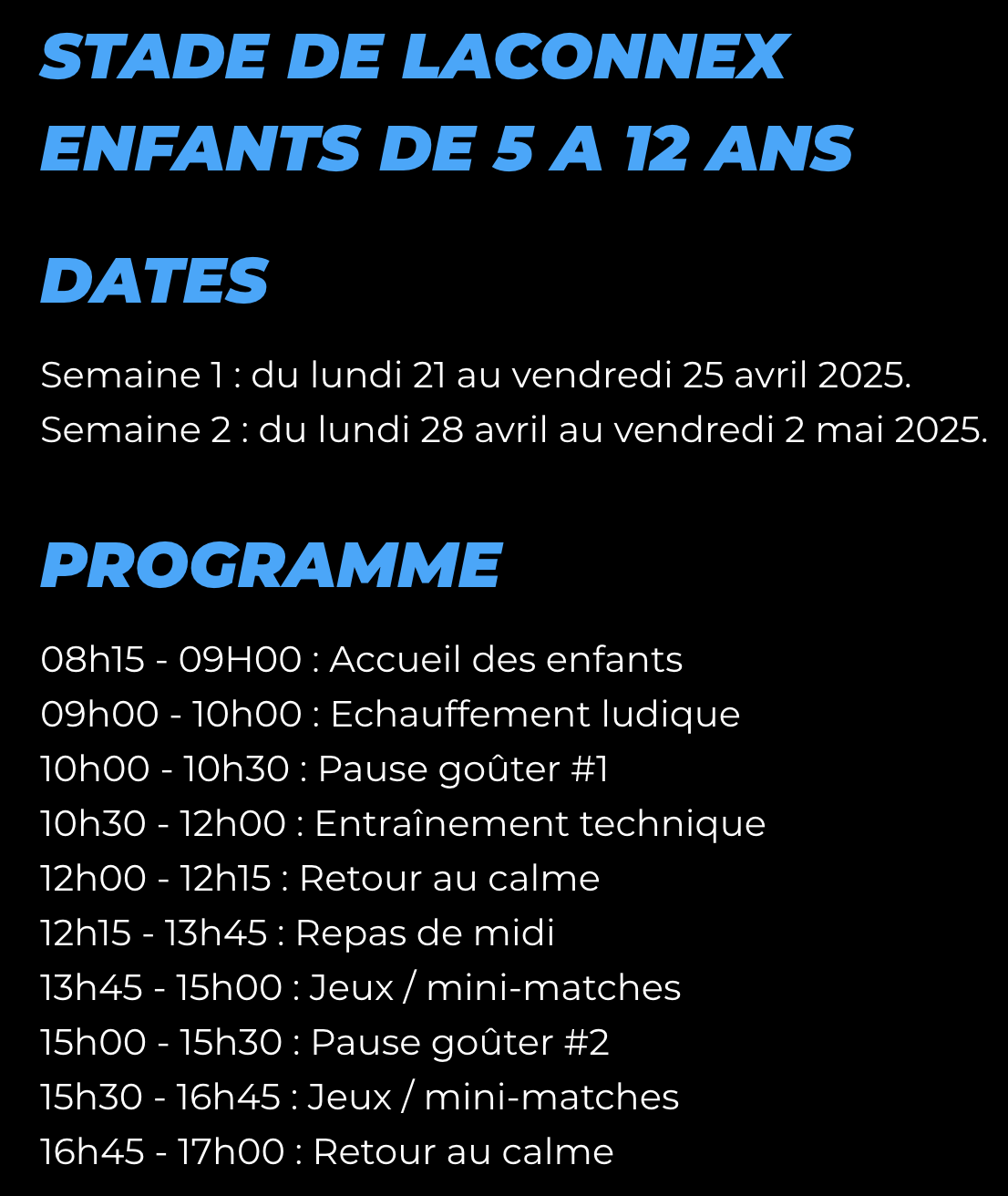 Nouveauté à Genève ! Fort d’une longue et riche expérience dans le paysage du football genevois ainsi que dans l’organisation de camps pour enfants, Luis Moës s’apprête à lancer un projet innovant. Dès ce printemps, « Moe’s Footkids » proposera des journées entières de football pour les enfants entre 5 et 10 ans. Celles-ci se tiendront tous les mercredis (hors vacances scolaires) au stade de Laconnex.