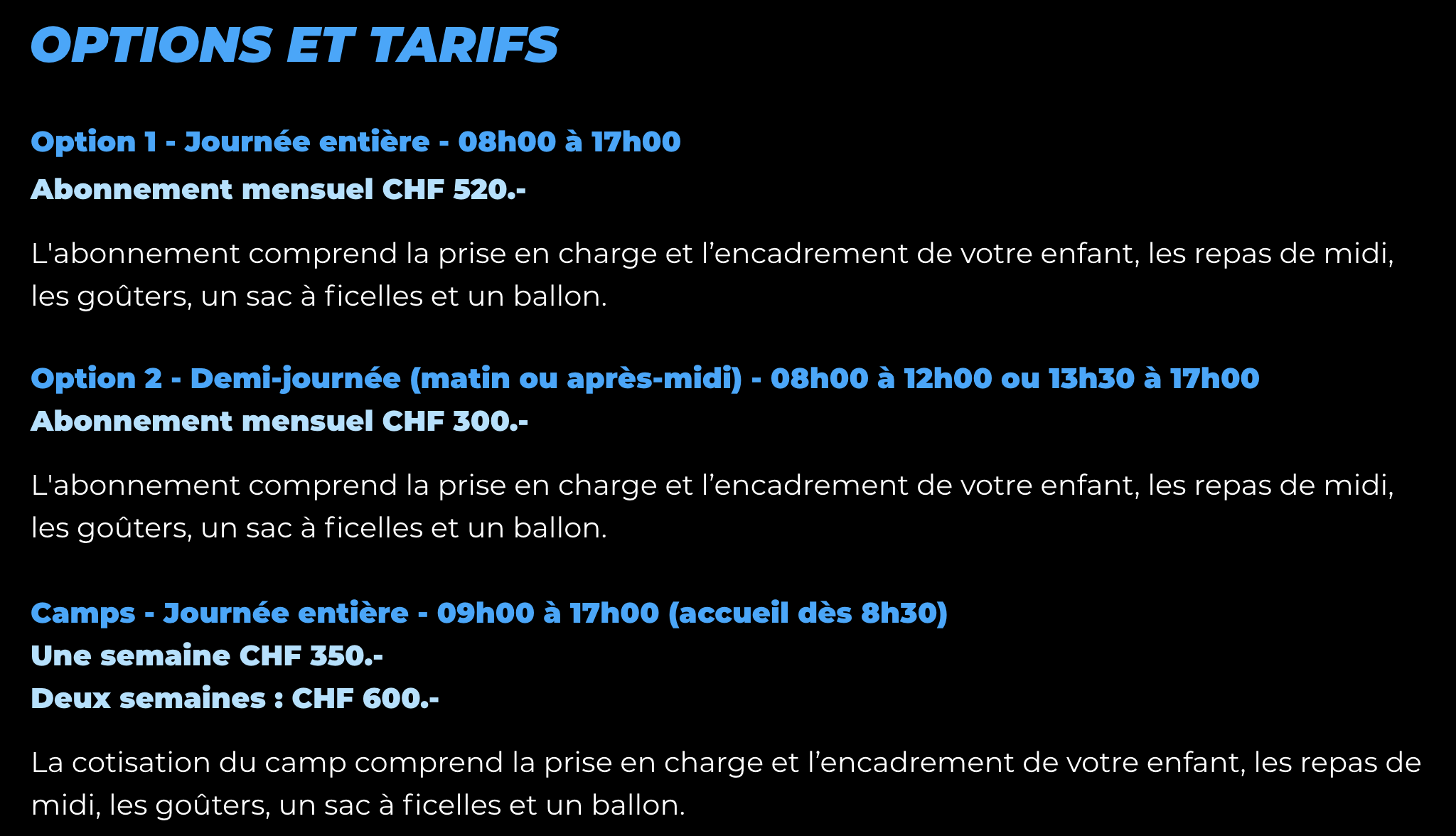 Les inscriptions se font par mois, sur le site moesfootkids.com. Le coût d’inscription pour une journée s’élève à 130.-, 70.- pour la demi-journée. “Le repas de midi et le goûter sont inclus. Et chaque enfant reçoit un ballon”, précise l’organisateur. À noter que seulement une vingtaine de places seront à pourvoir pour les camps du mercredi, et ce afin de garantir un encadrement de qualité.