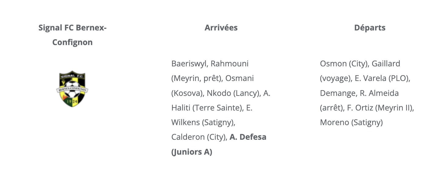 Signal Bernex est actuellement le Genevois le moins bien loti, puisque les Bernésiens sont installés juste au-dessus de la barre (15 matchs, 20 points). Pour rappel, cette position pourrait être synonyme de relégation, car les deux moins bonnes équipes juste au-dessus de la barre des 4 groupes de 2ème ligue inter au niveau national seront reléguées.