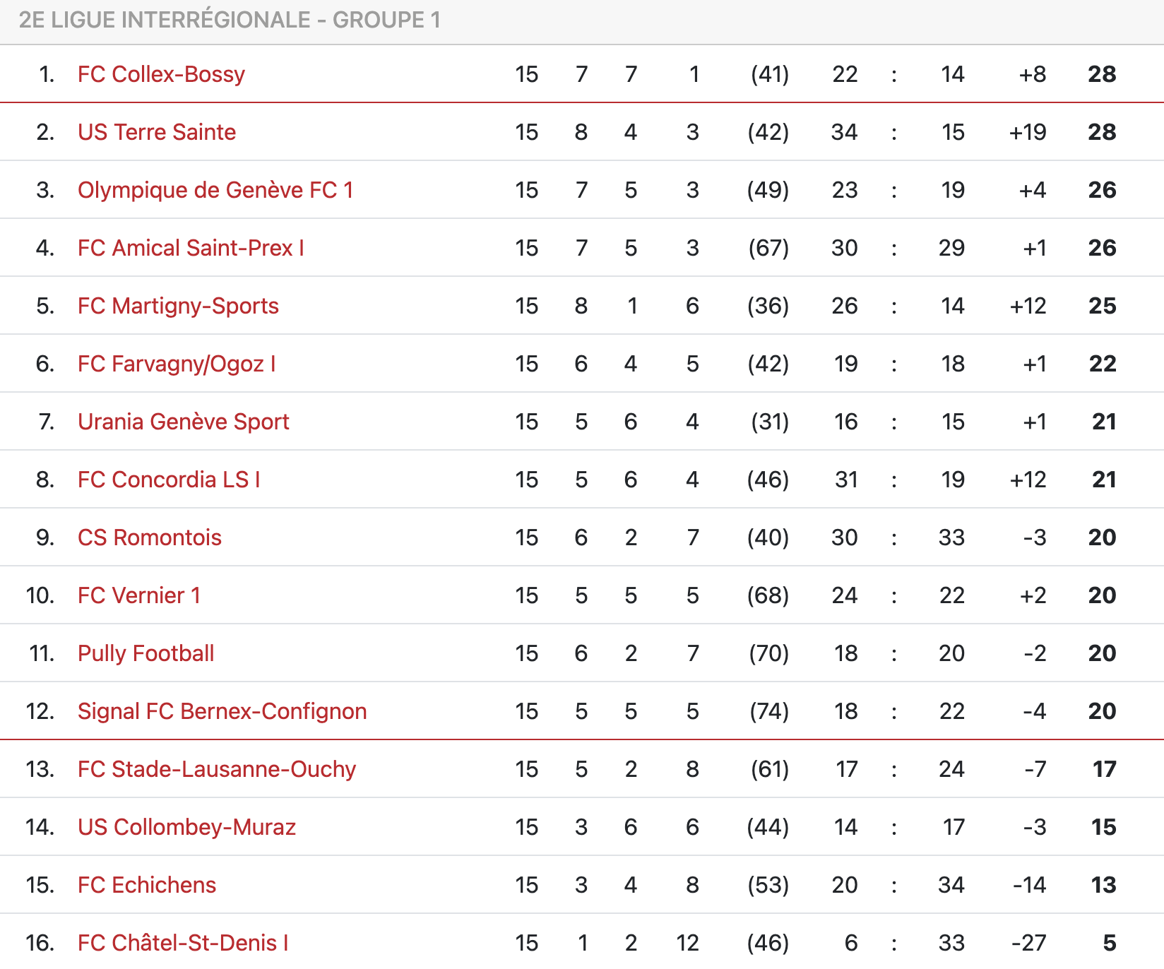 Groupe 1 : Signal Bernex = 1.33pt/matchh (15 matchs, 20 points)