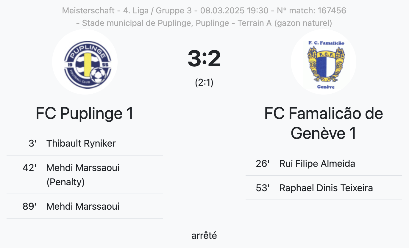 Le match de 4ème ligue entre le FC Puplinge et le FC Famalicão de Genève a été arrêté en raison de débordements qui ont suivi le 3-2 de l’équipe locale, à la 89ème.