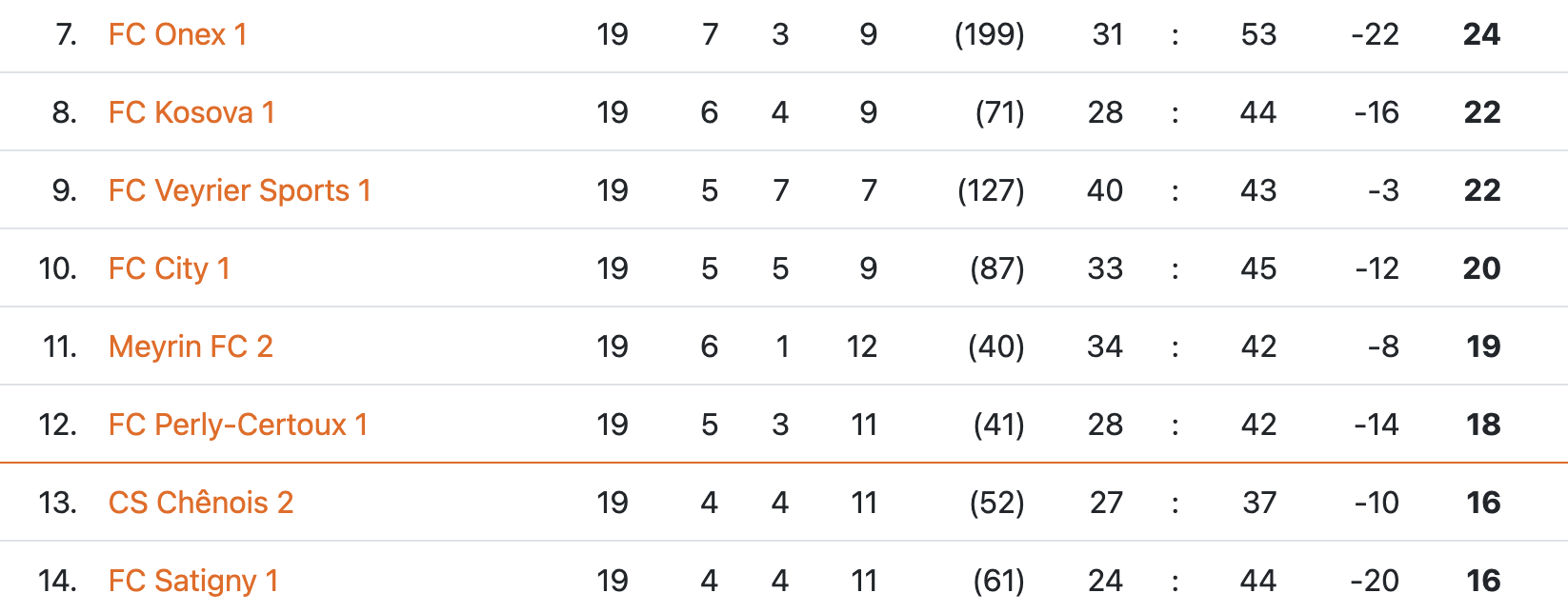 Parmi les sept équipes fermant la marche en 2ème ligue, aucune d’entre elles n’a pris des points lors du week-end du 5-6 avril ! Chênois II, Meyrin II, City, Veyrier et Kosova ont perdu, tandis que Satigny et Perly se sont annulés. De quoi resserrer encore plus l’étau dans la bataille pour éviter la relégation.