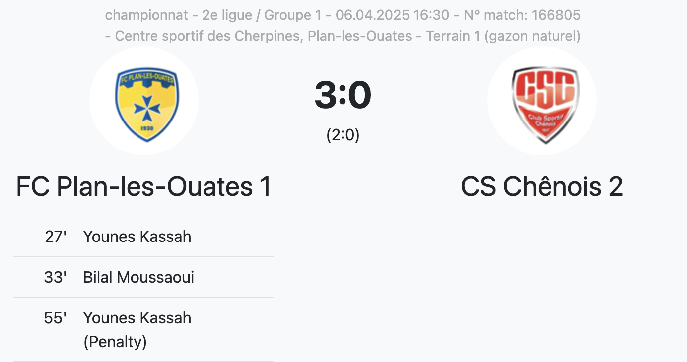 Lui aussi confronté à une affiche déséquilibrée sur le papier, Chênois II n’a pas pu éviter la défaite contre Plan-les-Ouates (3-0). Après leur victoire du week-end dernier contre Meyrin II, les hommes de Romain Pétremand et Carlos Alonso n’ont pas réussi à enchaîner. Peu après la demi-heure, PLO menait déjà 2-0 (27′ Younes Kassah, 33′ Bilal Moussaoui).