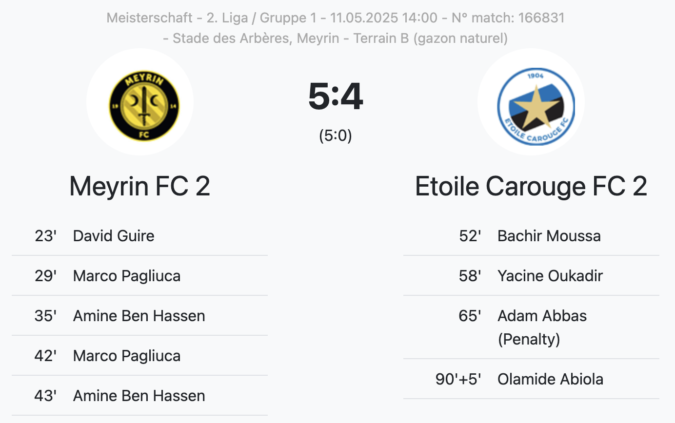 Assuré de ne pas pouvoir monter à la première place même en cas de victoire à Meyrin (dimanche, 14h), Etoile Carouge II pouvait tout de même revenir à un point du duo Azzurri-PLO. Les Stelliens sont toutefois passés à côté de leur première mi-temps (5-0 !), et ne sont pas parvenus à revenir en deuxième, malgré une belle remontée pas conclue (score final 5-4).