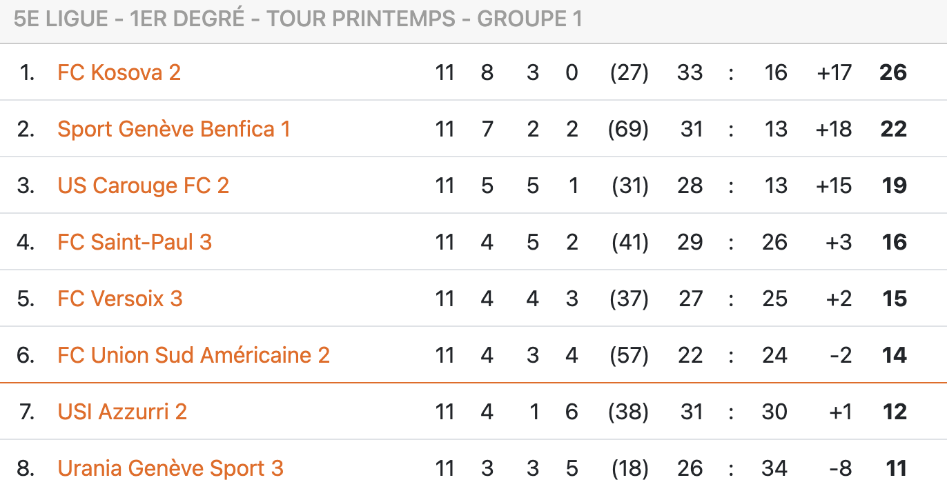 Le deuxième tour du FC Kosova II, champion, a été quasiment impeccable. Les Kosovares n’ont laissé échapper que quatre points, sur les trente à disposition (matchs nuls contre US Carouge II et UGS III, aucune défaite). La formation coachée par Elton Lika a remporté le dernier match de sa saison dimanche 25 mai au stade de la Californie contre St-Paul III (4-5). Les Rouge et Noir ont ensuite reçu leur trophée et ont pu fêter comme il se doit. Une belle récompense après deux saisons compliquées, qui auront vu les pensionnaires de Frontenex glisser de la 3ème ligue à la 5ème ligue.
