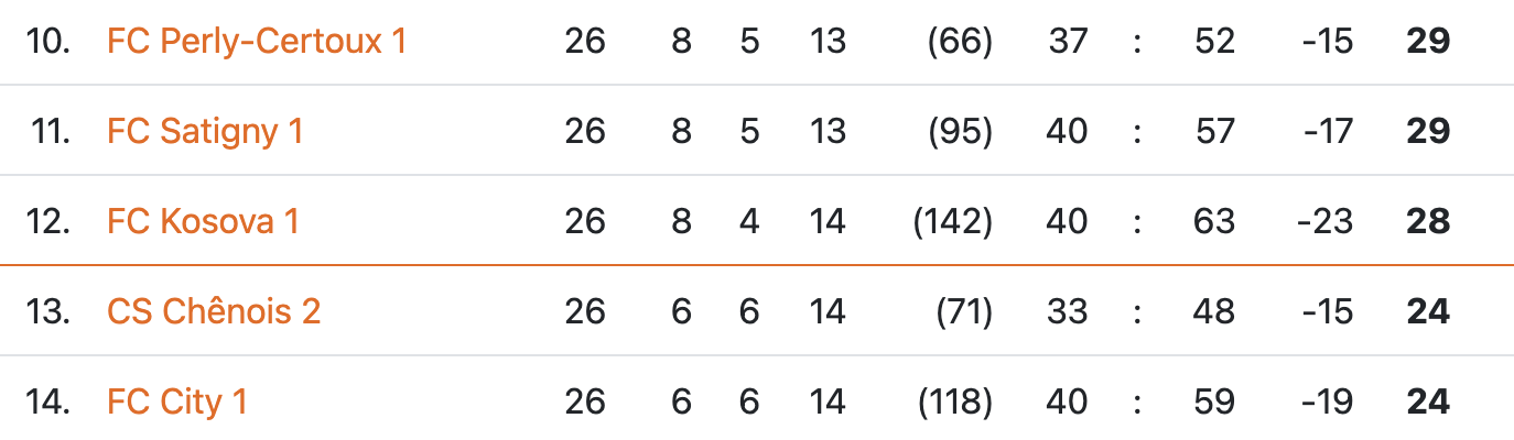 City et Chênois II sont donc les deux équipes reléguées en 3ème ligue. Pour rappel, les deux devaient obligatoirement s’imposer, tout en espérant qu’au moins l’une des deux équipes entre Perly et Satigny s’incline. Au final, aucune des deux équipes n’a mené contre Azzurri et Carouge II, et aucun des concurrents n’a été mené. Une matinée sans espoir.