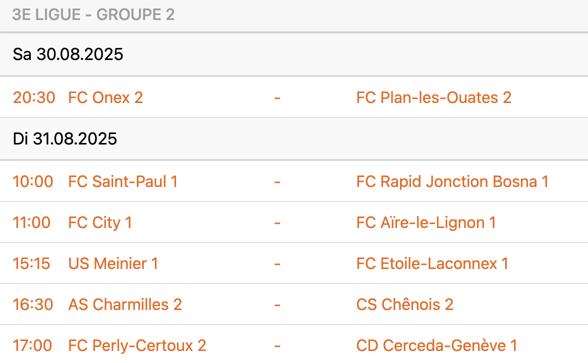 Quatre équipes n’ont pas encore été évoquées : le FC Rapid Jonction Bosna ainsi que les Deux de Perly, Onex et PLO. Les deux dernières formations mentionnées s’affronteront d’ailleurs lors du match d’ouverture, samedi 30 août à 20h30 (Onex II – PLO II).