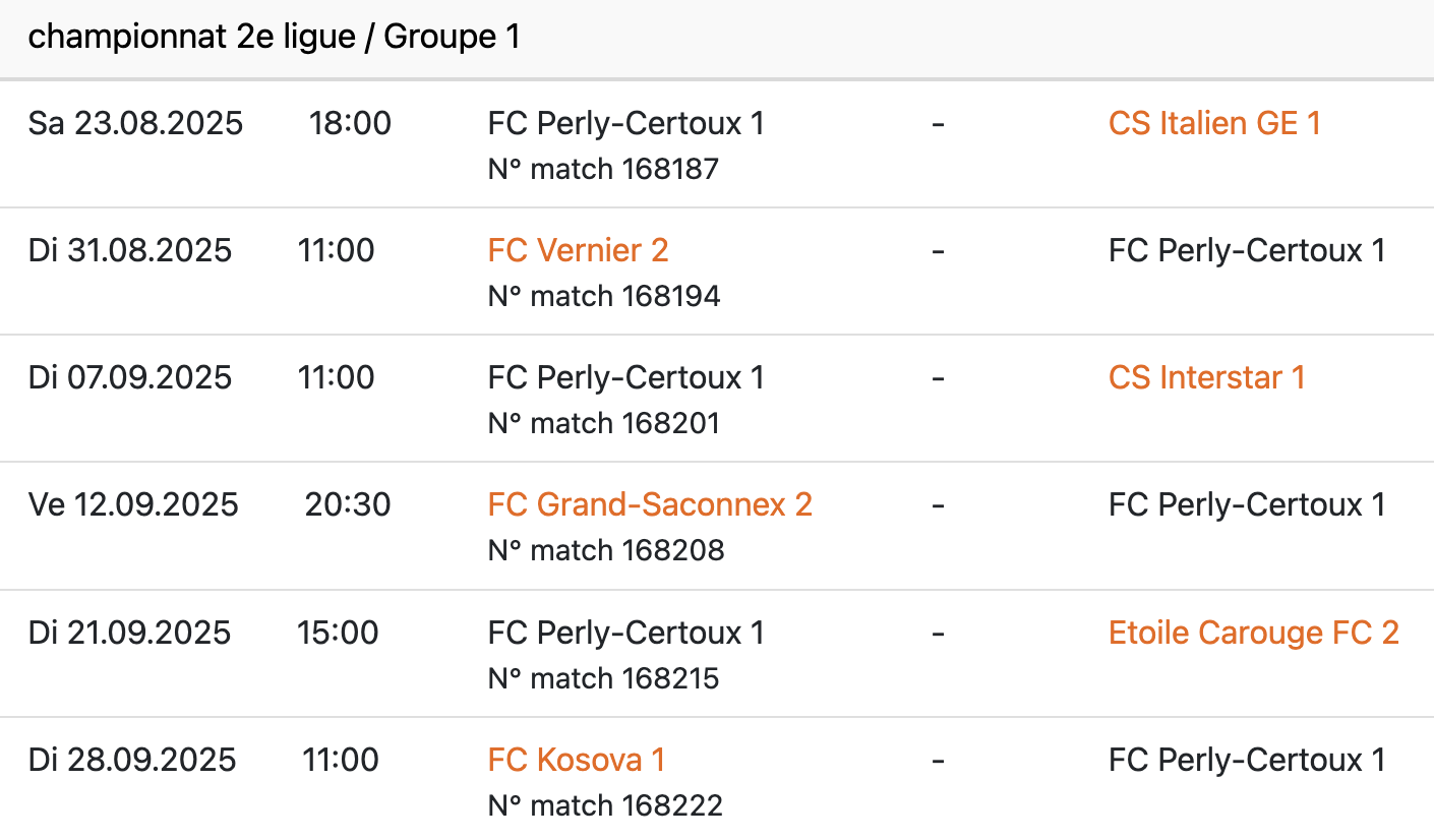 Le calendrier qui attend Perly lors des premières semaines de compétition.