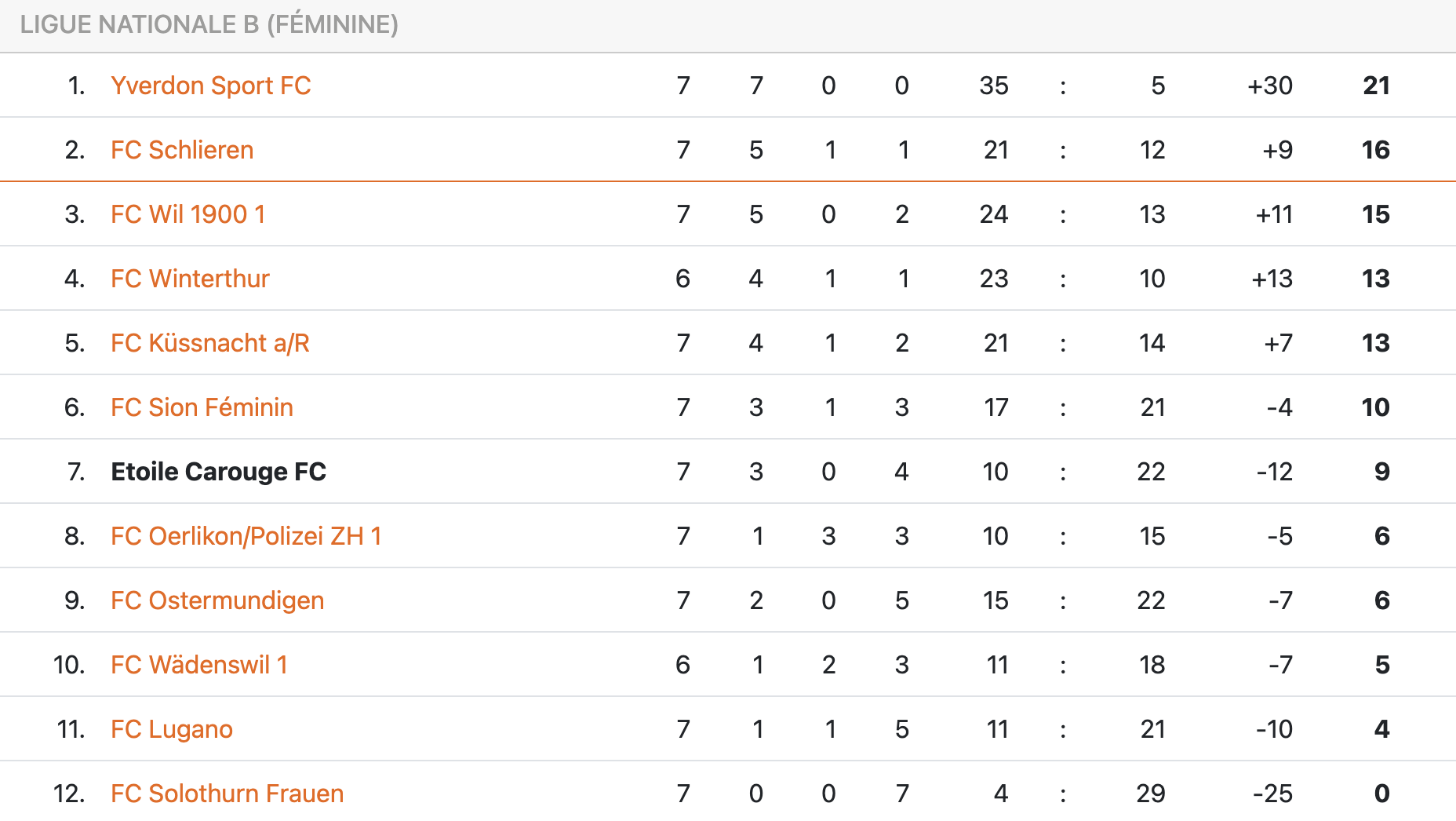 Logiquement battu par plus fort, Etoile Carouge boucle sa semaine anglaise avec 0 point dans la besace, après s’être déjà incliné mercredi à Ostermundingen. Au total, les Carougeoises ont obtenu 9 points en 7 matchs de championnat. Il faudra avoir un tout autre rythme de croisière pour espérer accrocher le top 2 en fin de saison. Prochain match le samedi 4 octobre à Schlieren, barragiste l’an dernier et actuel deuxième…