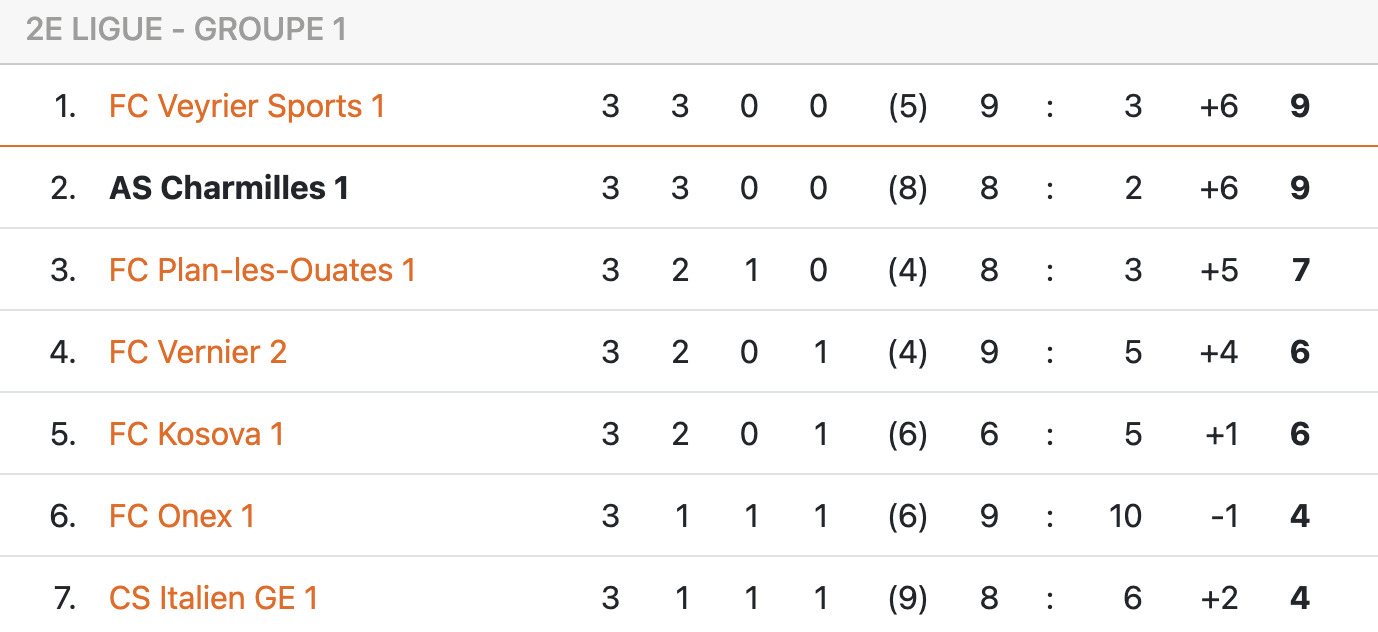 Quel début de saison pour l’AS Charmilles ! Néo-promus, les hommes de Drag Stevanovic ont fait le plein après 3 journées de championnat (victoires contre Meyrin II, CS Italien et Vernier II). Face à la réserve verniolane, autre équipe néo-promue très bien partie dans le championnat, les locaux ont passé l’épaule une première fois à la demi-heure sur penalty (Meshar Arifi), avant de s’assurer la victoire en deuxième période grâce aux recrues Hicham Manaa (52′, 2-0) et Danny Barbosa (69′, 3-0).