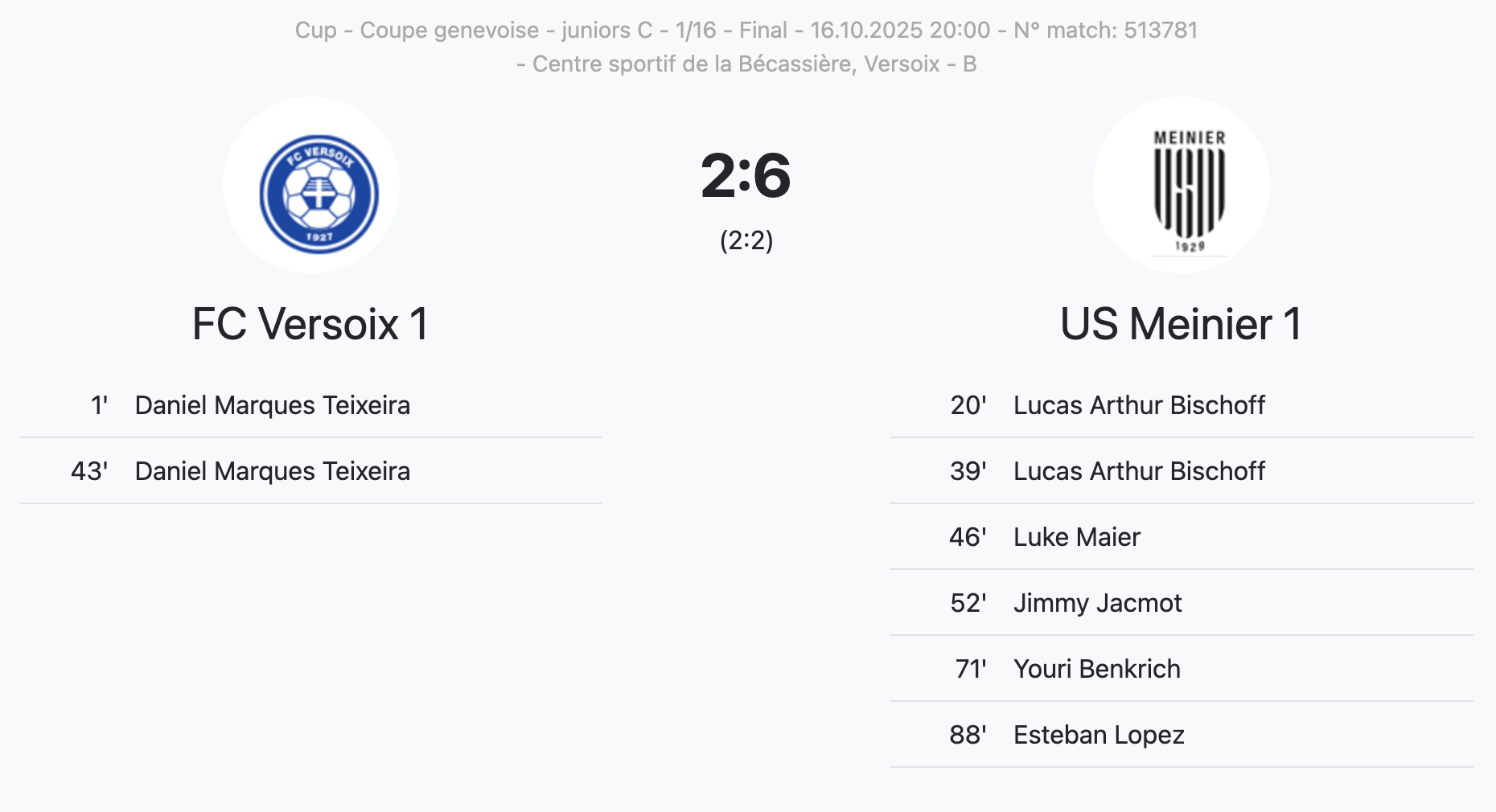 Les 1/16 de finale de Coupe genevoise, chez les Juniors C, se sont conclus jeudi 16 octobre avec la victoire des Meinites chez le FC Versoix (2-6).
