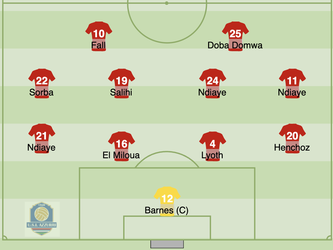 Azzurri (3-5-2) : Barnes © – Lyoth, El Miloua, I. Ndiaye (87′ Gaspar) – Alioune Ndiaye (90+2′ Mihajlovski), Ahmed Ndiaye, Henchoz, A. Salihi, Sorba (73′ Benmahdi) – Doba, Fall (90+2′ Alimi).