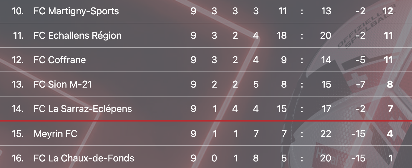La situation comptable n’est pas (encore?) urgente pour Meyrin, qui n’est qu’à 3 points du premier non-relégable, La Sarraz, après 9 journées. Toutefois, les pensionnaires des Arbères seraient bien inspirés de retrouver le chemin de la victoire pour revenir à -1 des M-21 du FC Sion, qui se déplaceront samedi en terres genevoises avec 8 points au compteur. Rendez-vous samedi 11 octobre à 19h.