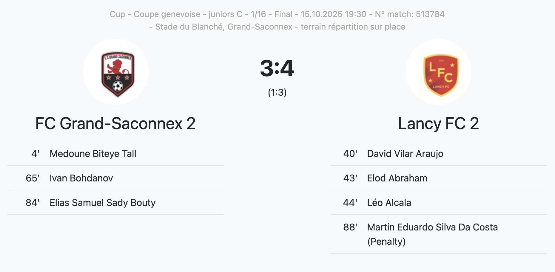 Lancy II a dû batailler au Blanché, pour éliminer Grand-Saconnex II. Les locaux menaient 1-0 (4′ Medoune Biteye Tall), puis, les Lancéens ont renversé la situation avant la pause (1-3). Grand-Sac est revenu à 3-3 à la 84′ (Elias Samuel Sady Bouty), mais les visiteurs ont à nouveau marqué sur pénalty à la 88ème (Martin Eduardo Silva Da Costa).