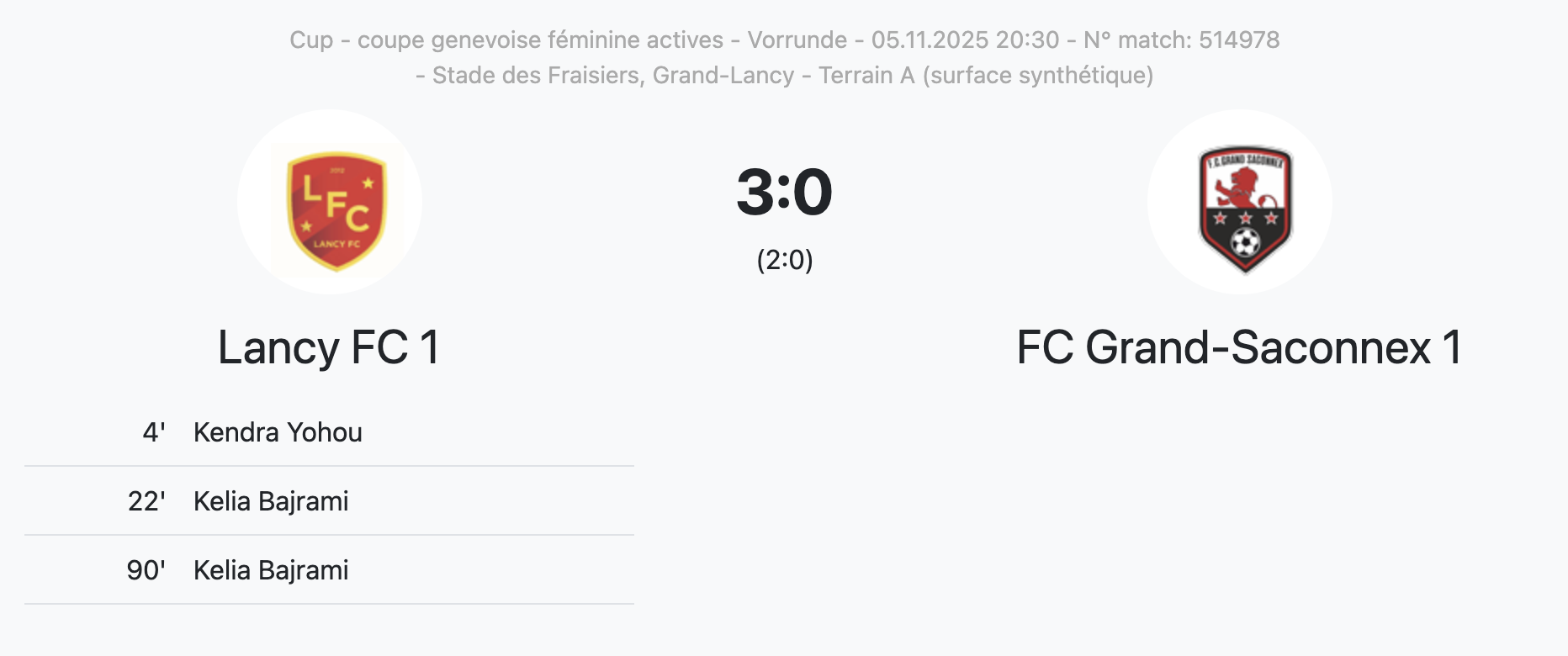 Sur le papier, l’autre affiche la plus relevée de ce tour préliminaire mettait aux prises Lancy et Grand-Saconnex. Les Saconnésiennes, en forme en championnat (4e ligue), étaient face à un grand défi, puisqu’elles se déplaçaient chez un Lancy FC qui vient de boucler un premier tour parfait en 3e ligue (11 matchs, 11 victoires). Kendra Yohou (4′, 1-0), puis Kelia Bajrami (22′ et 90′) ont permis à l’équipe de Johan Djourou et Loïc Tschudin de se hisser en 1/4 de finale.
