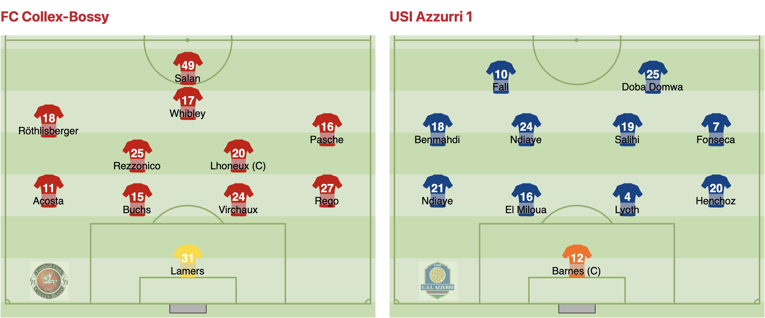 Collex (3-5-2) : Lamers – Rego, Virchaux, Buchs – Pasche, Rezzonico, Lhoneux ©, Whibley, Acosta – Röthlisberger, Salan (remplacé après 2′ par Terrier).