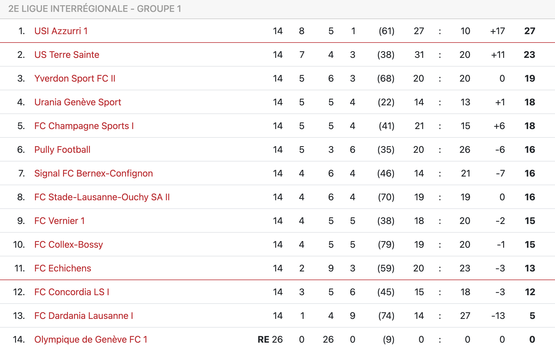Le classement complet du groupe 1 de 2e ligue inter à la trêve.
