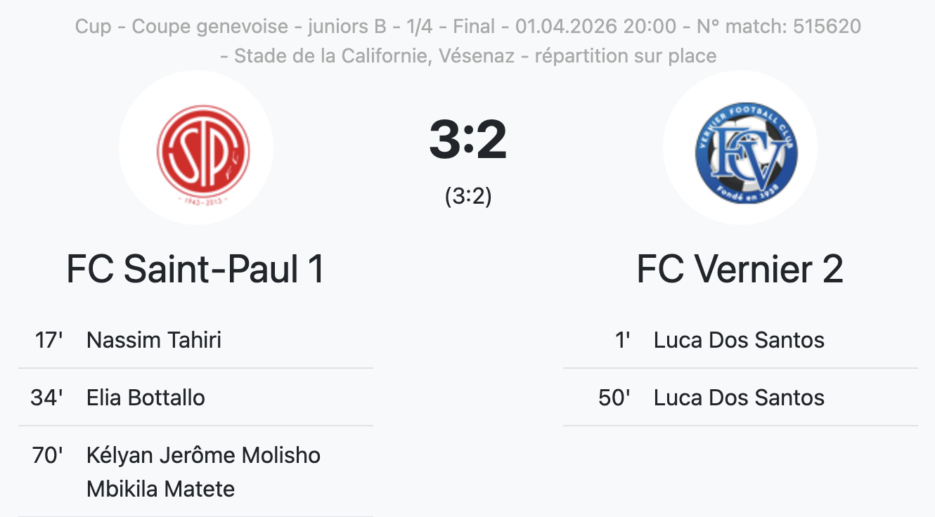 En 1/4 de finale, les Saint-paulois avaient réussi à prendre le meilleur sur Vernier (3-2), qui avait pourtant ouvert le score, puis était revenu à 2-2. Kélyan Jerôme Molisho Mbikila Matete avait finalement inscrit le but décisif pour Saint-Paul, à la 70e minute.