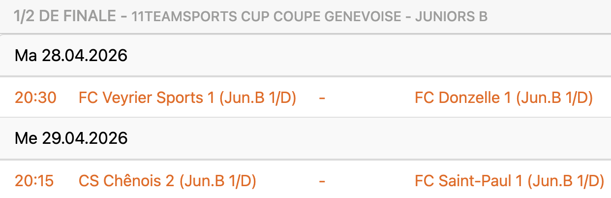 En demi-finale, l’équipe entraînée par Frederic Joseph Pierre Giddio et Nolan Vernaz se déplacera aux Trois-Chêne, pour affronter le CS Chênois. En 1/4, l’équipe entraînée par Quentin Lopes De Oliveira avait éliminé Grand-Saconnex (4-1). Lucas Alexandre Rodrigues avait été le héros de la soirée avec son triplé.