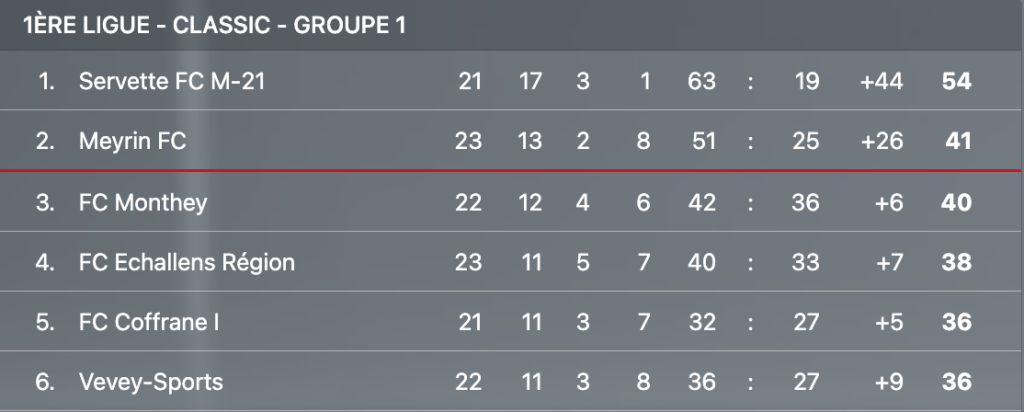Cette cinquième victoire meyrinoise consécutive ne souffre donc d’aucune contestation. Voilà des années que les Jaune et Noir n’avaient pas connu un tel état de forme, surtout à ce moment-clé de la saison. Installée à la deuxième place (avec un match de plus de Monthey, qui accueille Servette M21 samedi), l’équipe des Arbères a désormais devant elle pas moins que trois déplacements. À Naters, aux Libellules contre Servette et enfin aux Trois Sapins à Echallens. Un calendrier ardu, mais ce Meyrin-là ne doit craindre personne. Comme l’avait notamment souligné le capitaine Matteo Rezzonico après la victoire contre Coffrane, Meyrin est à cette place car il l’a mérité…et il semble avoir toutes les cartes en main pour la conserver. Vivement la suite !