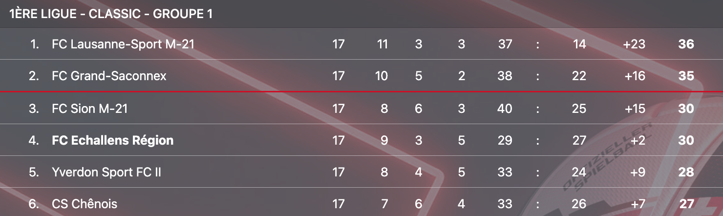 La bonne affaire semblait servie pour Echallens. Avec le match nul entre Grand-Saconnex et Sion M-21, les Challensois avaient vu des adversaires directs perdre des plumes et pouvaient en profiter pour gagner du terrain dans la course aux finales. Devant au score jusqu’à la nonantième, l’équipe de Fabio de Almeida a finalement dû se contenter du point du nul. Dereck Isabella a en effet égalisé sur penalty dans le temps additionnel. Un dénouement frustrant pour les Jaune et Vert, mais aussi un précieux point obtenu par Pully dans la course au maintien.