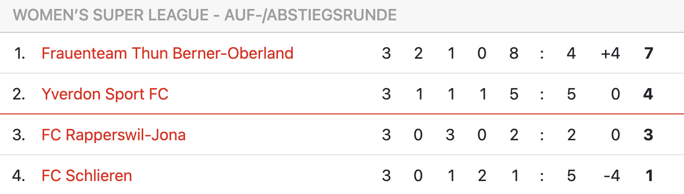 Parmi les 4 équipes prenant part à ce tour de promotion-relégation, Thoune est sans doute la plus redoutable d’entre elles. Les joueuses de l’Oberland conserveront d’ailleurs vraisemblablement leur place dans l’élite, avec déjà 7 points obtenus après 3 journées.